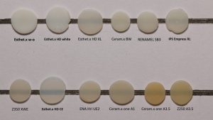 ۴-رنگ مناسب برای هر فرد به رنگ چهره ، رنگ سفیدی چشم ، رنگ دندان زیرین، رنگ لثه، حتی جایگاه اجتماعی فرد، عادت یا عادت نداشتن به آرایش کردن بستگی دارد. یک رنگ واحد می تواند در دهان افراد مختلف بسته به شرایط فوق ،متفاوت دیده شود.مثلا اگر ونیر کامپوزیت دوست شما به رنگ A2 بوده است ، همین رنگ حتی از همان برند در دهان شما بسته به رنگ دندان و لثه و ضخامت ماده متفاوت دیده میشود. تصویر زیر نشان میدهد که چگونه یک شماره رنگ از برندهای مختلف پوشش دهی مختلفی دارد.